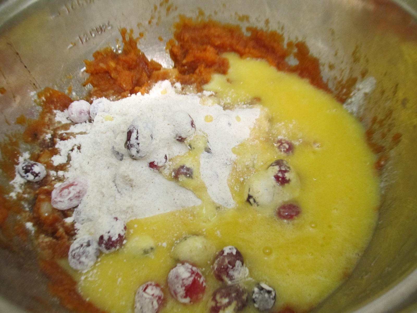 I still have my original dark orange color seventies bundt pan along with a couple newer ones, and an awesome mini heavy duty pan, a 'thrift find'...which I love to bake in. I didn't want to take time browsing for a recipe, so I just used my 'trusted' basic banana bread recipe that I have memorized, modified it, and added the pumpkin and the fresh/frozen cranberries from Whole Foods.